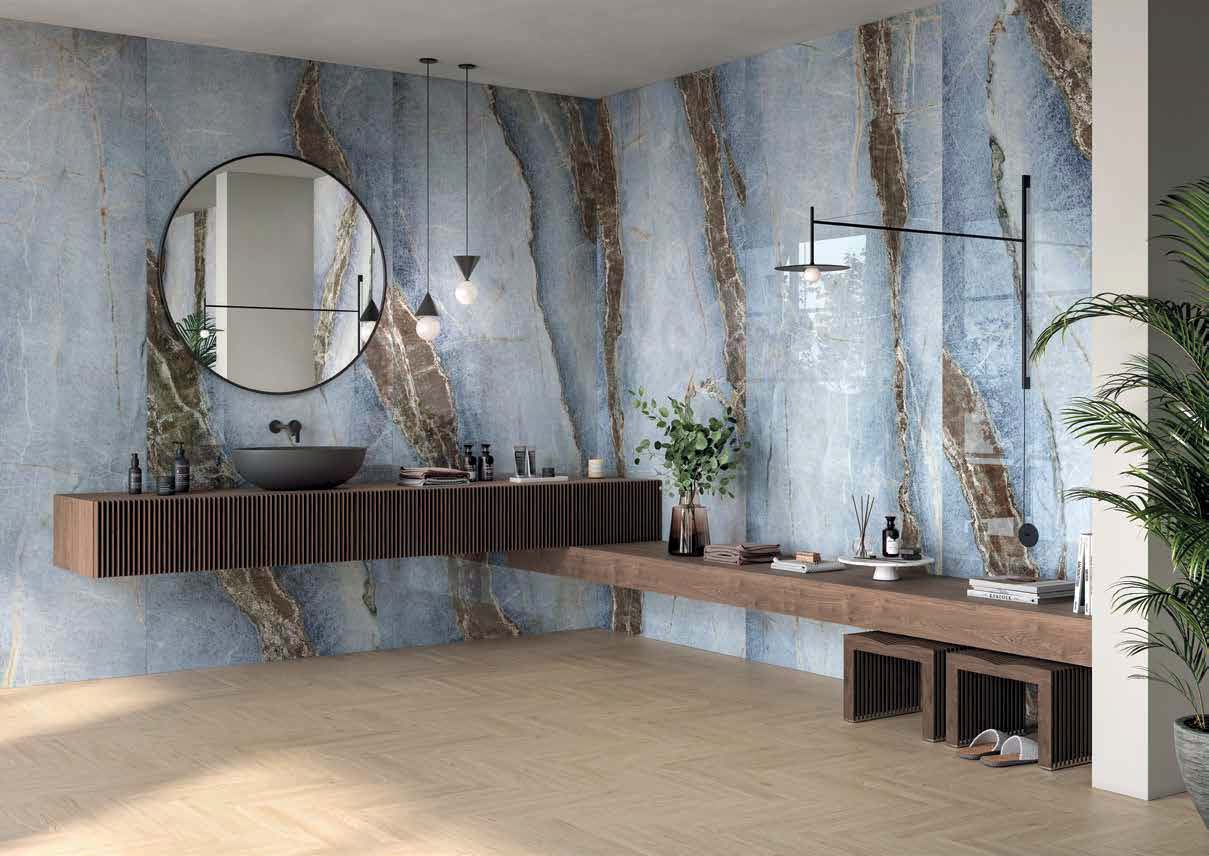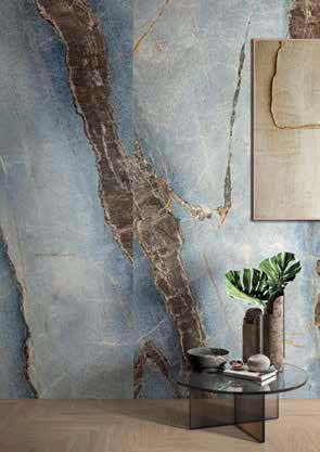 Lastra de 120x278 cm în finisaj Lappato mat atinge un echilibru rar: dimensiunea care elimină rosturile și creează suprafețe continue, asociată unui finisaj care redă lumina difuz, fără reflexii intense. Pe pereți verticali de înălțime totală, Onice Aragosta Lappato mat produce un plan cromatic coerent și profund – albastrul ceruleu și venaturile maro-portocalii percepute în toată complexitatea lor, fără ca finisajul să le distorsioneze sau să le aplatizeze. Este formatul și finisajul pentru proiectele care tratează materialul ca element artistic de arhitectură interioară.