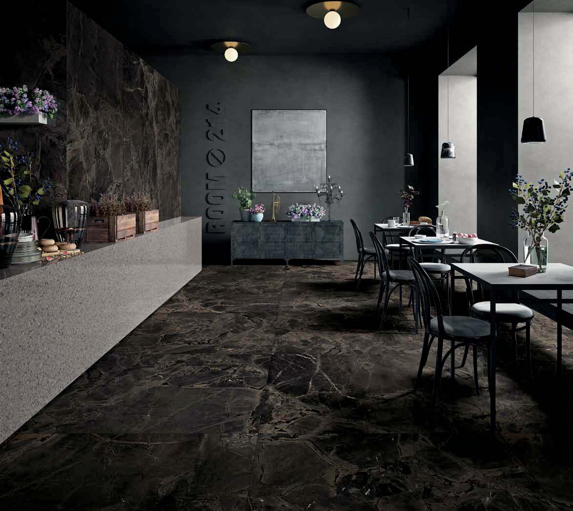 Infinity Brazil provine dintr-un cuarțit rar din America de Sud, cu culoare neagră intensă și deosebit de elegantă — o caracteristică tonalitate neagră intersectată de puncte de lumină specifice structurii cristaline a cuarțitului. Spre deosebire de orice piatră neagră convențională, Infinity Brazil poartă în sine o luminescență naturală care Lappato o activează și o amplifică vizual. Imola The Room  o reproduce cu 4 grafice diferite, colorare în masă, rectificare monocalibru, grosime 6,5 mm.