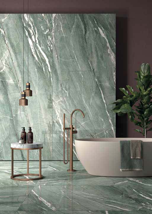 TIFFANY GREEN din Imola The Room redefinește marmura verde prin nuanțe gradate și vene elegante, capturând esența naturii în design interior. Grosime 6.5 mm optimizează transportul. Gresie porțelanată rectificată DA, V2, R9, interior.